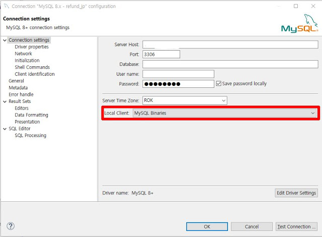 1. Connection Settings항목에서 Local Client 지정하는 항목을 선택한다.
