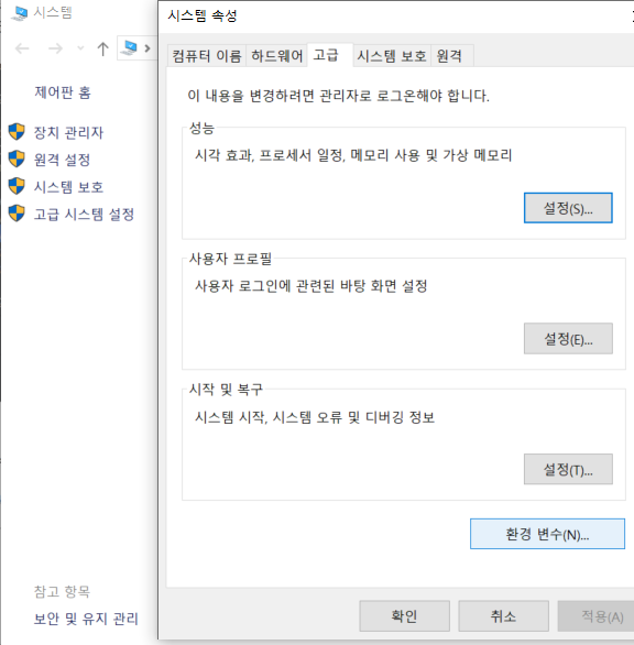 5.2 고급 시스템 설정 > 고급 > 환경 변수