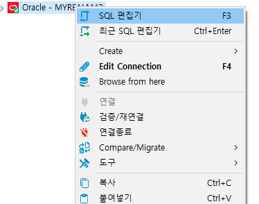이후 새로 생긴 데이터베이스에 우클릭 후 SQL 편집기를 생성하고