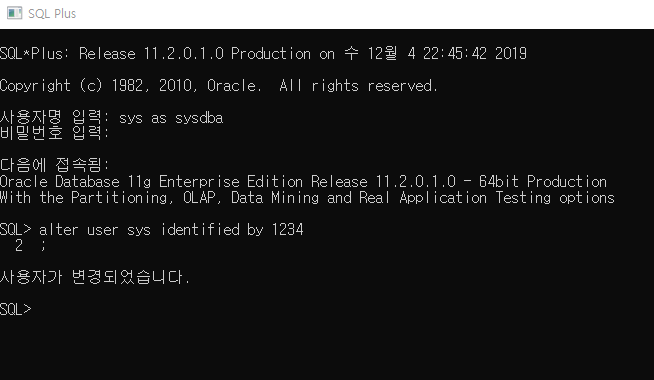 alter user sys identified by 1234;로 변경한 뒤