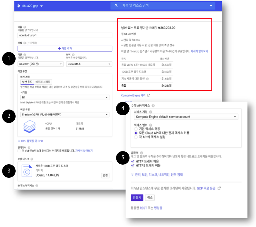 : 머신 설정은 f1-micro를 설정합니다. 다른 유형도 선택은 가능하지만 유료입니다.