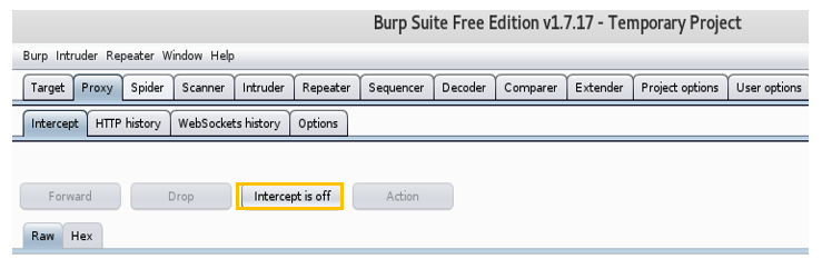 우선 Burp Suite의 Proxy 탭에서 Intercept 기능이 꺼져있는지 확인 한다. 켜져있다면 꺼준다.