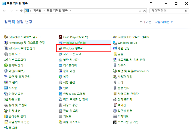 이제 컴퓨터에 접근하는 방화벽에서 정책을 허용하면 원격 데스크톱 연결 설정이 완료됩니다. 원격 컴퓨터의 제어판을 열고 윈도우 방화벽으로 이동합니다.