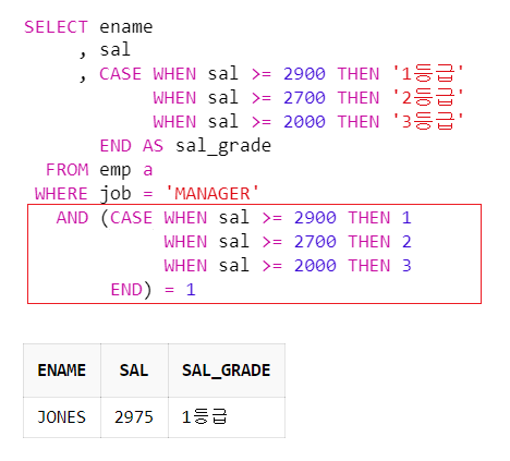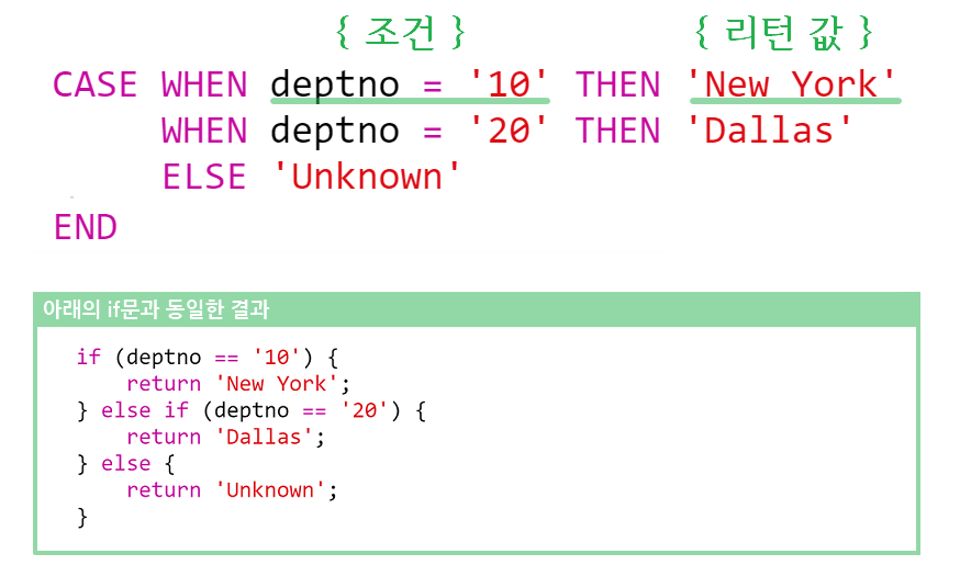 오라클에서 if 문과 비슷한 기능을 하는 DECODE 함수가 있다. 그러나 DECODE 함수는 조건이 많아지면 가독성이 떨어지고 복잡해지며, 가장 큰 문제는 오라클 SQL에서만 사용할 수 있는 비표준 함수이다.