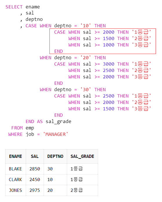 CASE 표현식에서 ELSE 부분은 생략이 가능하며, 만족하는 조건이 없으면 NULL을 리턴한다. CASE 표현식은 SELECT 절, WHERE 절, PL/SQL 등 많은 부분에서 사용이 가능하다.