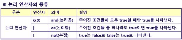논리 연산자는 피연산자로 boolean형 또는 boolean형 값을 결과로 하는 조건식만을 허용한다.