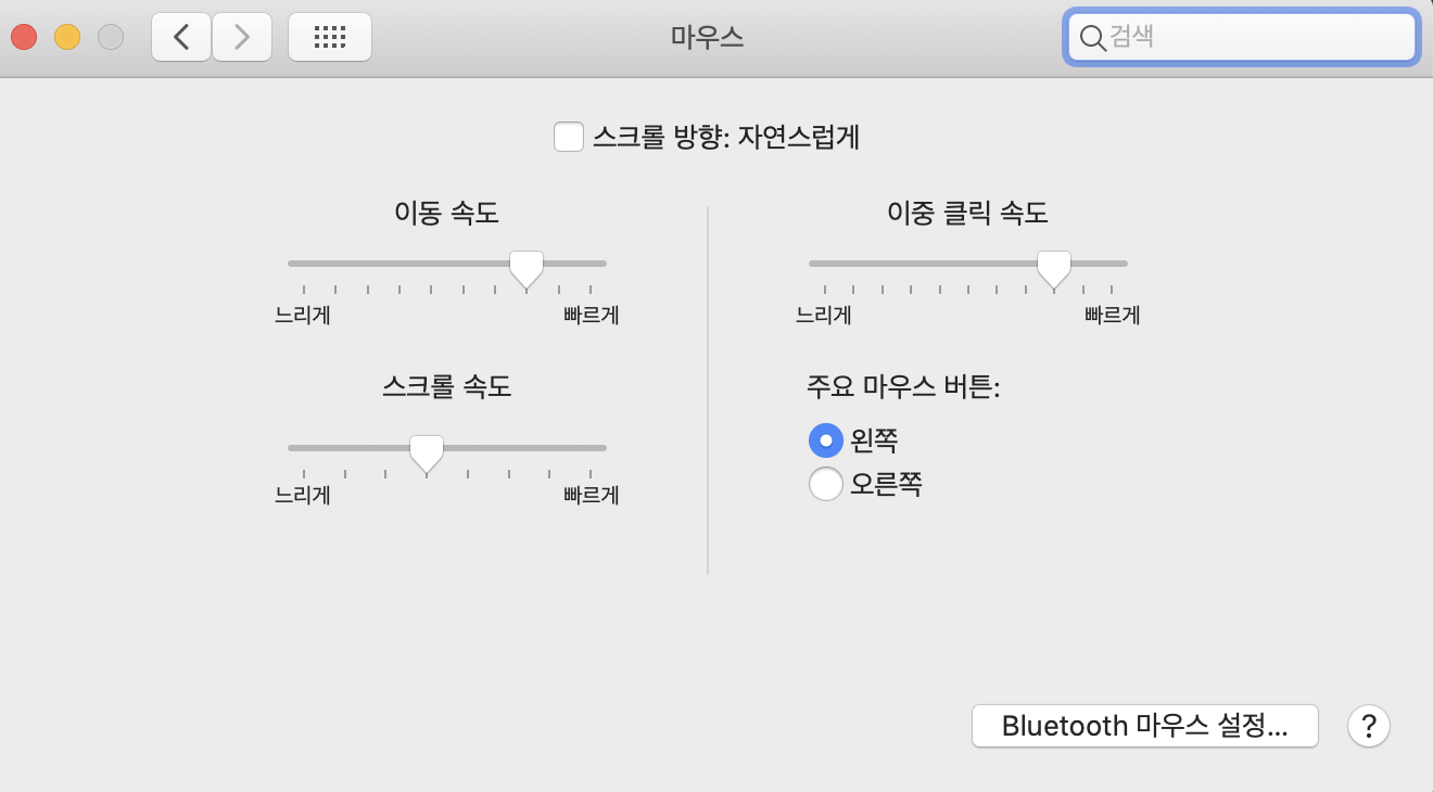 1. command + space 를 눌러서 마우스를 검색하여 마우스 설정창을 연다.
