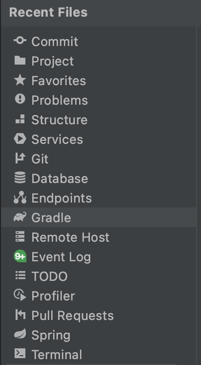 1. command + e 를 눌러서 아래와 같은 창이 뜨면 Gradle 항목을 클릭한다.