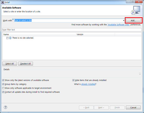 1). Help >> Install New Software.. 선택
