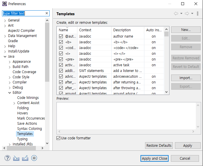 [개발/툴] eclipse java templates example / 이클립스 자바 템플릿 설정 방법