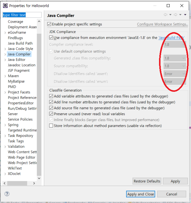 위 그림처럼 뜬 팝업에서 왼쪽메뉴들 중 java Compiler 를 클릭하면