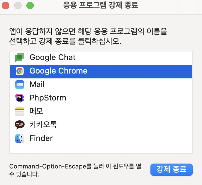 ( 이미지는 chrome 강제 종료로 되어있지만, 원래는 강제종료라는 메뉴가 있습니다.
