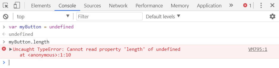 var a = new Array(4294967295); //OK var b = new Array(-1); //range error var num = 2.555555; document.writeln(num.toExponential(4)); //OK document.writeln(num.toExponential(-2)); //range error! num = 2.9999; document.writeln(num.toFixed(2)); //OK document.writeln(num.toFixed(25)); //range error! num = 2.3456; document.writeln(num.toPrecision(1)); //OK document.writeln(num.toPrecision(22)); //range error!8. TypeError: Cannot read property 'length'