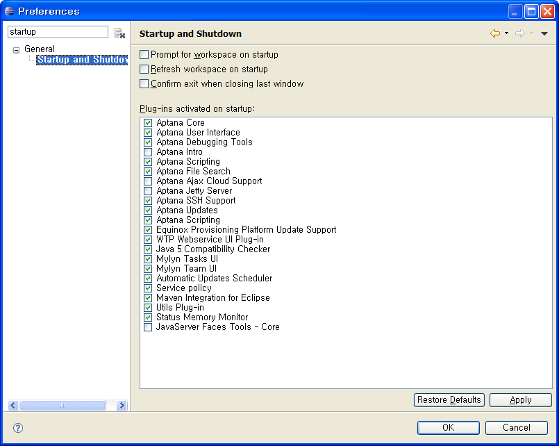 작업에 꼭 필요하지 않다고 생각되는 것들은 시작 항목에서 빼버리게 되면 그만큼 eclipse의 시작 실행속도가 빨라지게 된다. 이 항목에서는 또한 eclipse 종료시에 대한 설정도 할수 있다.