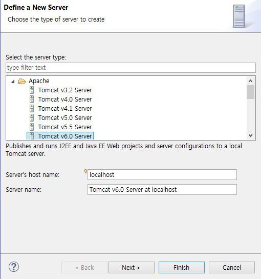 위와 같은 창이 나옵니다. Apache 하위의 Tomcat v6.0 Server 를 선택하고 Next 버튼을 누릅니다.