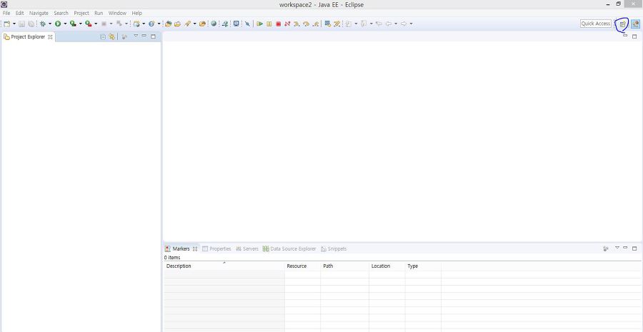 화면 우측 상단에 동그라미..... 쳐놓은 아이콘에 마우스를 대보시면 Open Perspective 라고 설명이 나옵니다. 해당 아이콘을 클릭하면
