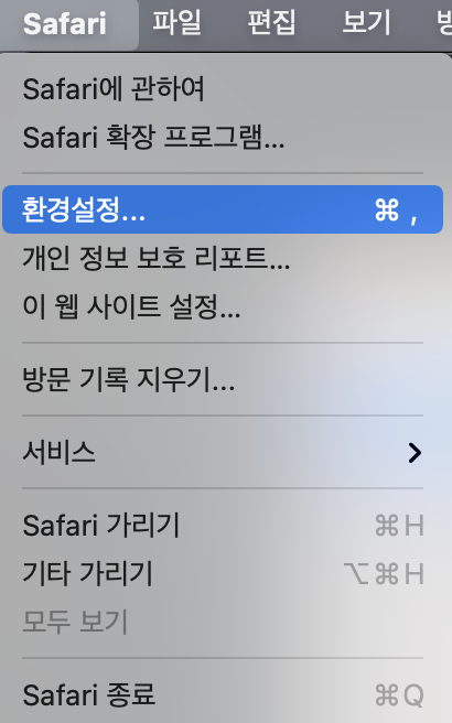 1. 상단에 Safari > 환경설정 메뉴로 이동합니다.