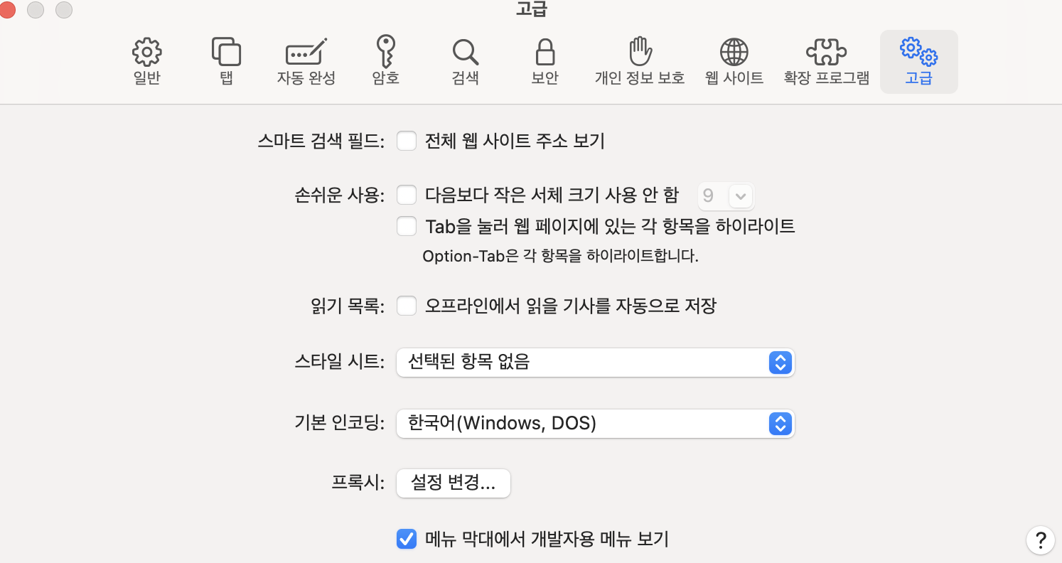 3. 그리고 나면 위에 사파리 관련 옵션 바에 개발자용 이라는 메뉴가 추가된것을 확인할 수 있습니다.