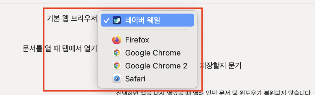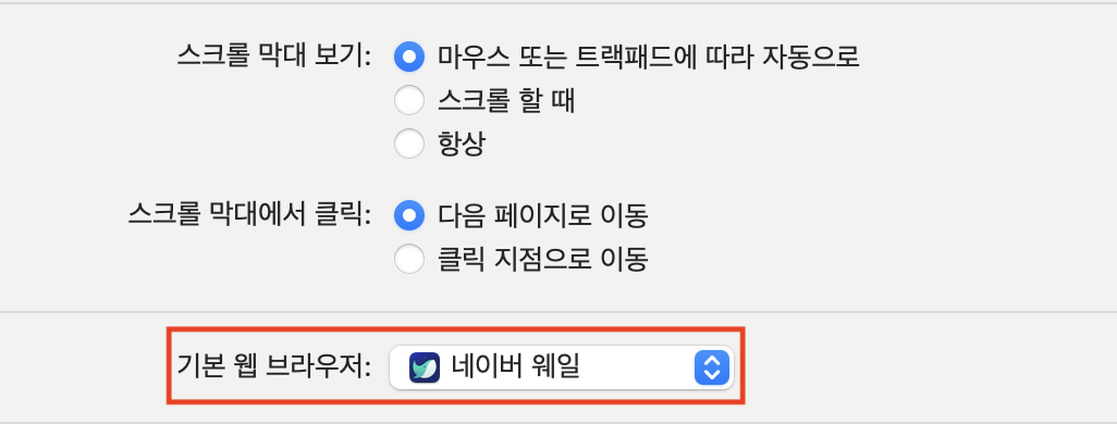 2. 일반 설정창이 열리면 아래 이미지와 같이 기본 웹 브라우저 옆에 셀렉트 박스를 선택합니다!