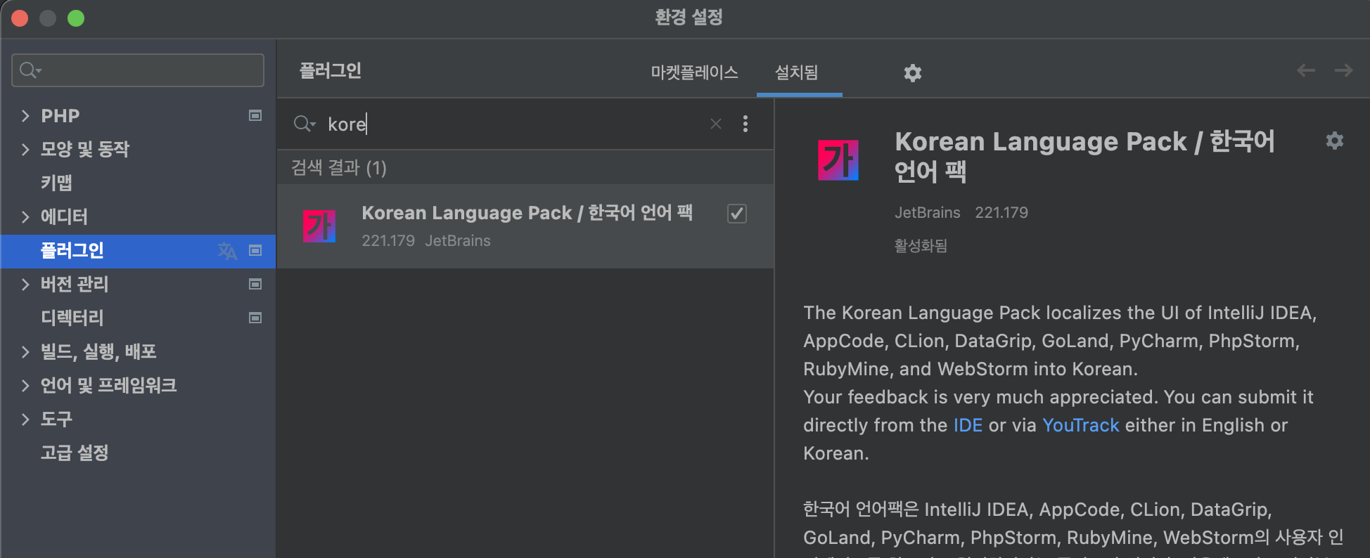 [개발/tools] phpstorm 한글 플러그인 해제 방법