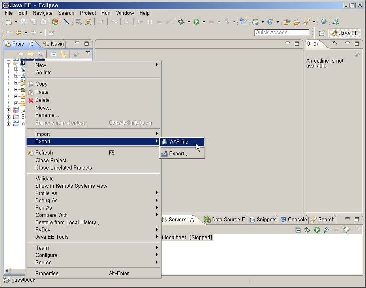 웹 어플리케이션을 배포하기 위해서는 우선 war배포 파일을 만들어야 합니다. 이클립스(Eclipse) Project Explorer에서 배포할 프로젝트 위를 오른쪽 마우스 클릭을 하고 Export - WAR file을 선택합니다.