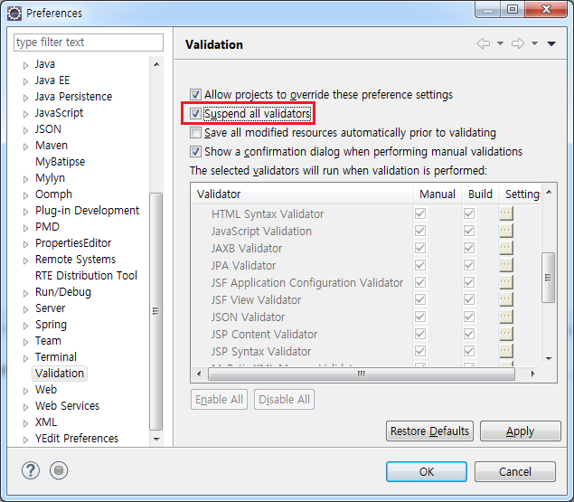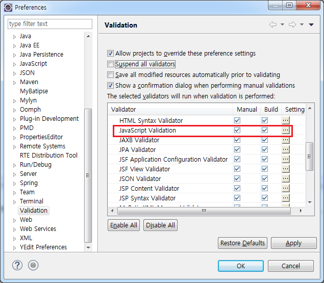 이클립스 설정을 그대로 사용할 경우 vailidation 설정을 그대로 사용하고 있는 경우가 많은데 중요하지 vailidation 설정을 해제하는 방법입니다.