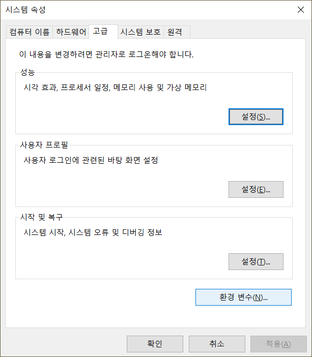 3. 설정창이 나오면 '고급'탭으로 바꾼 후 오른쪽 아래에 '환경 변수'를 클릭한다.