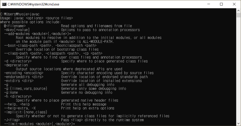 8. 자바 jdk의 경로와 Path의 설정이 완료되었다. cmd창을 켜놓았었다면 다시 실행시켜서 환경변수의 변경된 값을 적용시켜준다. 그리고 javac를 입력해 본다. 아래와 같은 창이 나온다면 성공한 것이다.