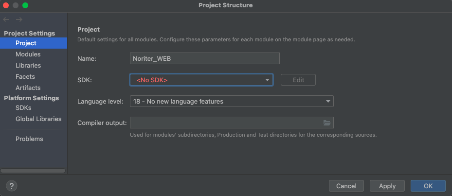 위 이미지와 같이 SDK 란에 No SDK 로 설정이 되어있을 겁니다.
