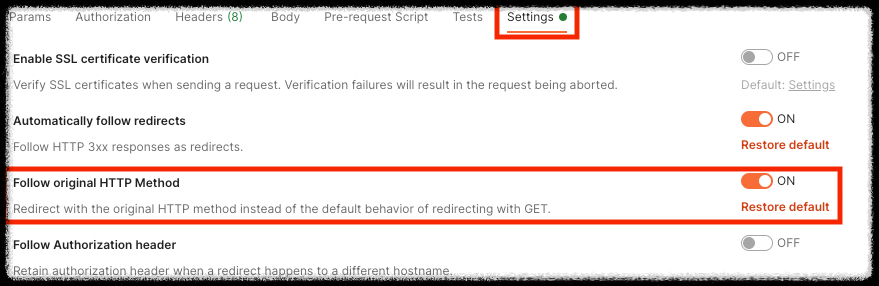 Follow original HTTP Method 라는 부분을 OFF -> ON 으로 변경하고 다시 실행해보면