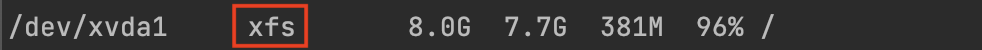 위 명령어를 실행해보면 아래와 같이 디스크 정보가 나오는데요, 빨간 박스와 같이 xfs 라고 되어 있으실 겁니다.