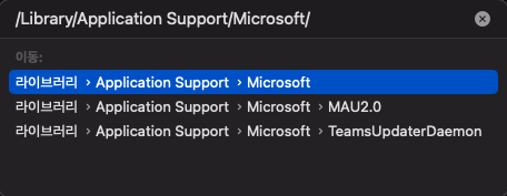 2. 그리고 아래 이미지처럼 /Library/Application Support/Microsoft 를 검색합니다!