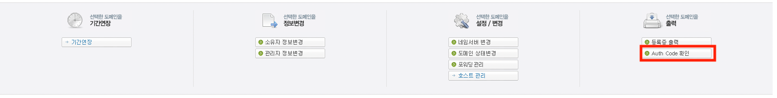 2. 도메인 기본관리 메뉴중 아래와 같이 화면 중간에 메뉴들이 나오는데 그중 빨간박스로 표시한, Auth Code 확인을 클릭합니다.