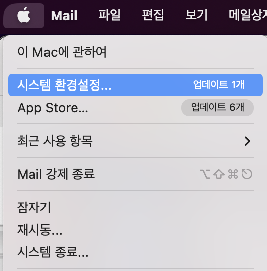 1. 왼쪽상단 사과모양 아이콘을 클릭하고 아래 이미지와 같이 시스템 환경설정을 선택합니다.