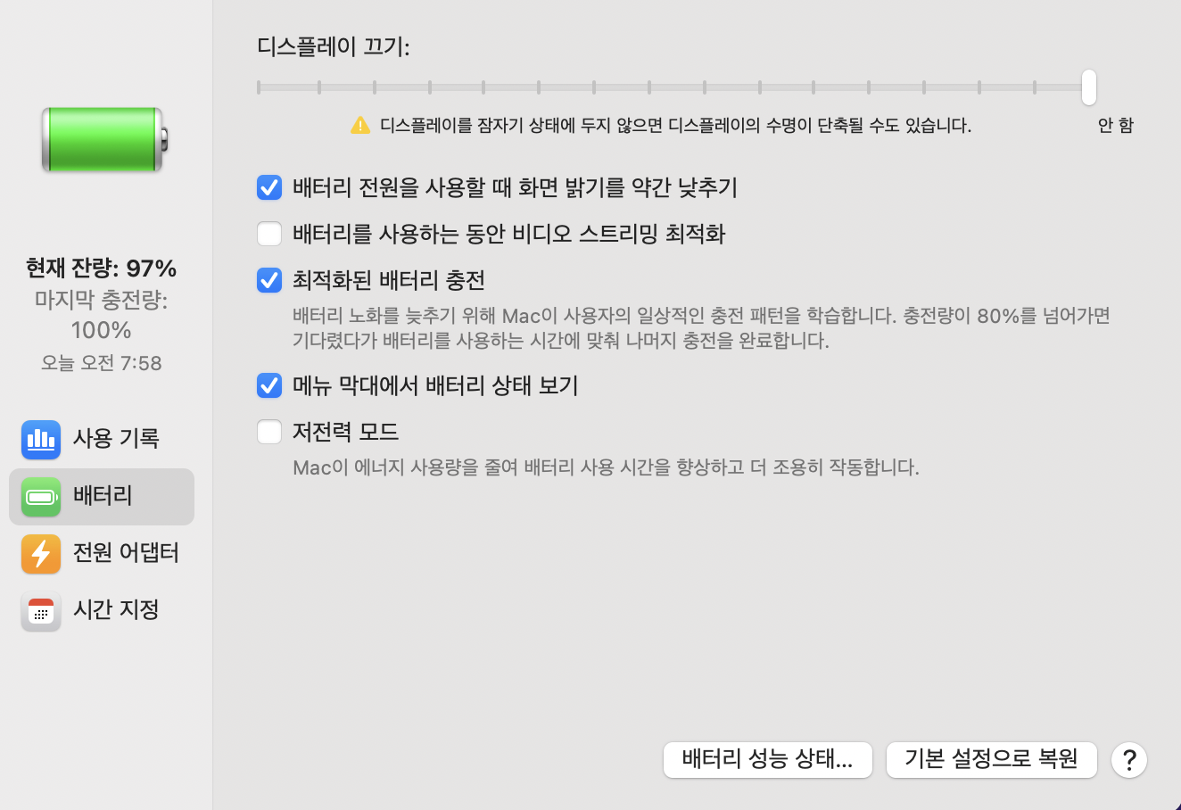 3. 배터리 설정창 왼쪽의 배터리라는 탭을 누르고 아래 이미지와 같이 디스플레이 끄기 를 안함 으로 설정하시면 됩니다!