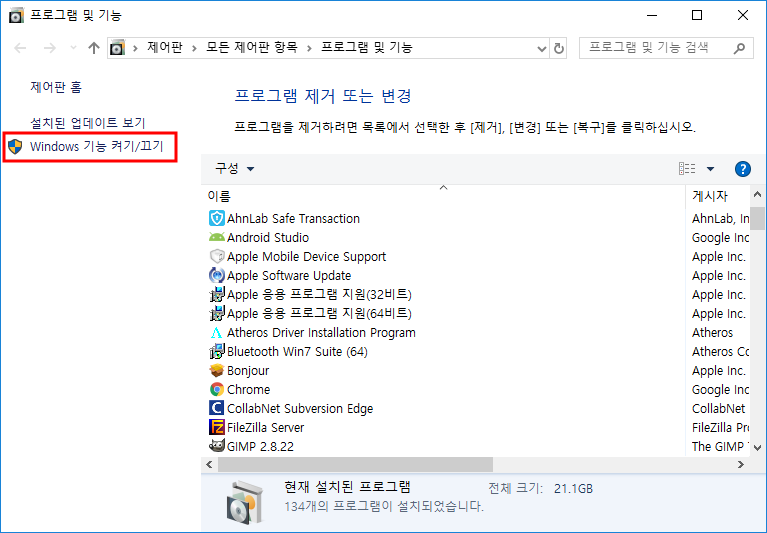 2. "프로그램 및 기능" 화면에서 "Windows 기능 켜기/끄기" 를 클릭합니다.
