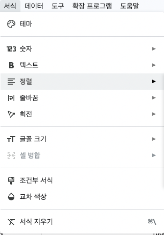 2. 아래 이미지와 같이 서식메뉴가 열리면 정렬이라는 메뉴에 마우스를 올리거나 클릭합니다!