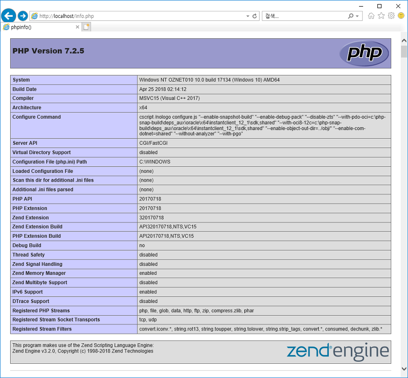 PHP INFO 페이지가 보여지면 제대로 연동이 된 것입니다. php.ini 는 C:\windows 폴더에서 찾도록 되어 있습니다.