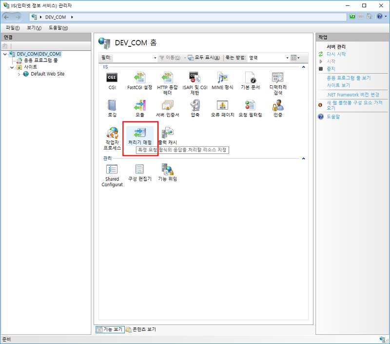 - IIS관리 콘솔을 실행해서 왼쪽 트리에서 컴퓨터 이름을 클릭하고, 오른쪽 화면에서 "처리기 매핑" 더블클릭합니다.