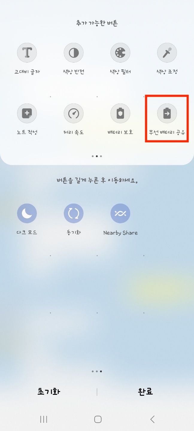 2. 추가 가능한 버튼 목록이 나오면 스와이프해서 무선 배터리 공유 라는 버튼을 찾아 아래 메뉴로 드래그해서 이동시켜 줍니다!