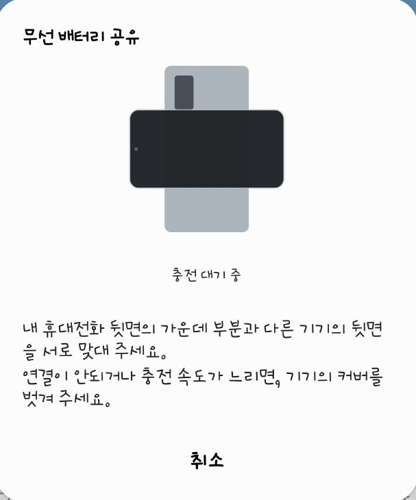 4. 기능이 활성화되면 아래 이미지와 같이 무선 배터리 공유 기능 안내 팝업이 나옵니다.