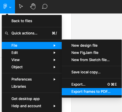 3. 파일 관련 메뉴들중 제일아래에 있는 Export frames tp PDF... 를 클릭하시고 저장하시면 됩니다!