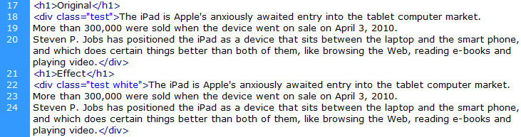 HTML 마크업은 다음과 같이 했습니다. 줄바꿈은 왼쪽에 보이는 라인넘버에서 알 수 있듯이 2번 하였습니다. 다시말해 단락이 3개라는 뜻 입니다. 스타일은 넓이를 400px 을 주고 사방으로 padding 을 10px 씩 주었습니다.