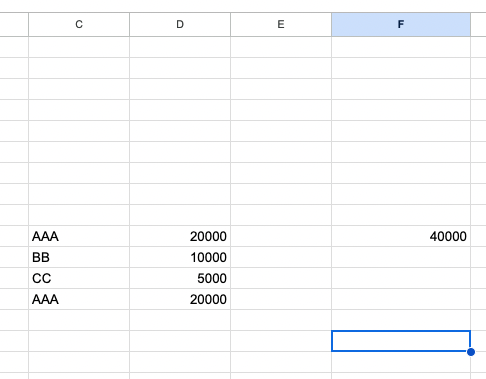 C열의 값들중 AAA 라는 값이 들어있는 행의 D 열값을 합시는 수식입니다.