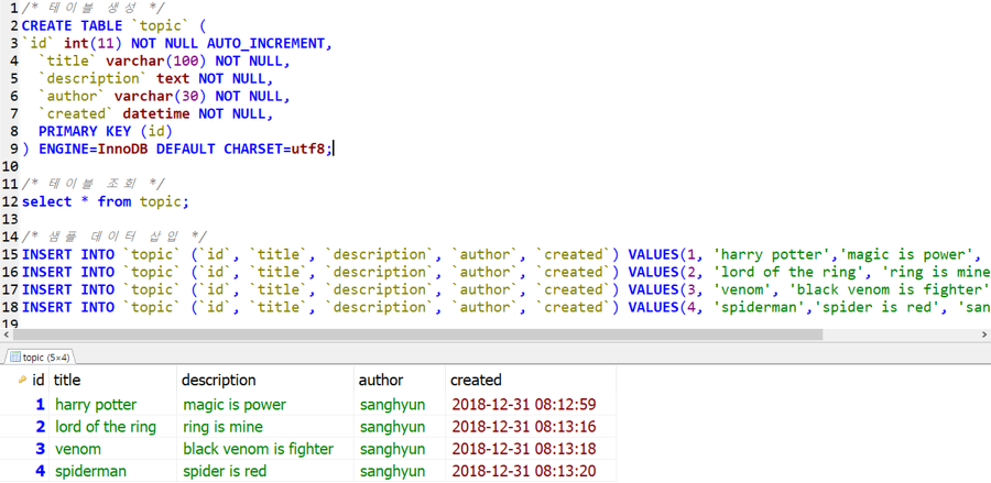/* 테이블 생성 */ CREATE TABLE `topic` ( `id` int(11) NOT NULL AUTO_INCREMENT, `title` varchar(100) NOT NULL, `description` text NOT NULL, `author` varchar(30) NOT NULL, `created` datetime NOT NULL, PRIMARY KEY (id) ) ENGINE=InnoDB DEFAULT CHARSET=utf8;