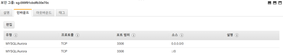 자신의 RDS의 보안그룹으로 들어가 Inbound를 위치무관으로 설정한다.
