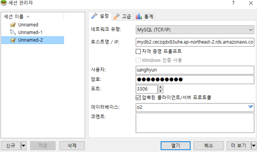 호스트명에 RDS 엔드포인트를 넣고 마스터 username과 password를 넣고 자신이 생성한 데이터베이스까지 넣어 접속해본다.