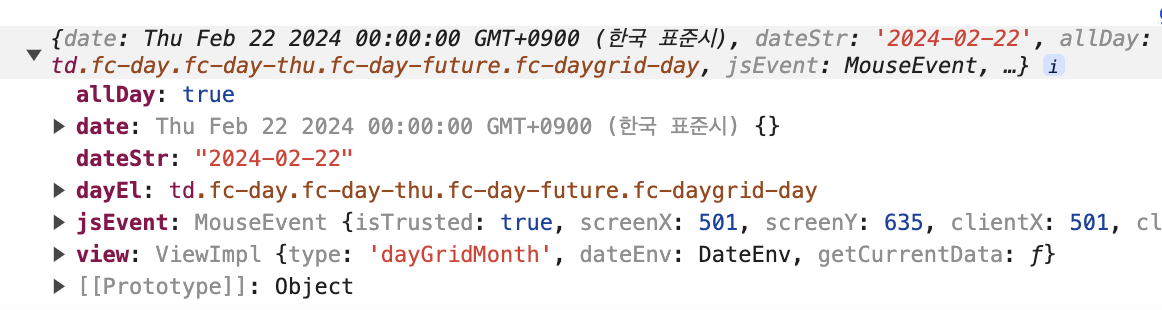 위 옵션을 추가 후 달력중 아무 날짜나 클릭했을때 출력되는 정보는 아래 이미지를 참고 하시면 됩니다!