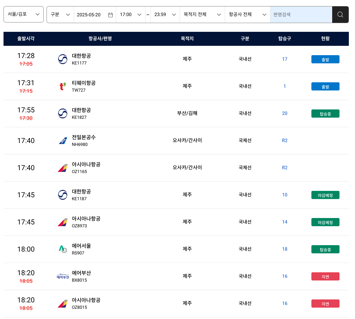 김포공항에서 항공편이 출발했는지, 도착했는지 등등