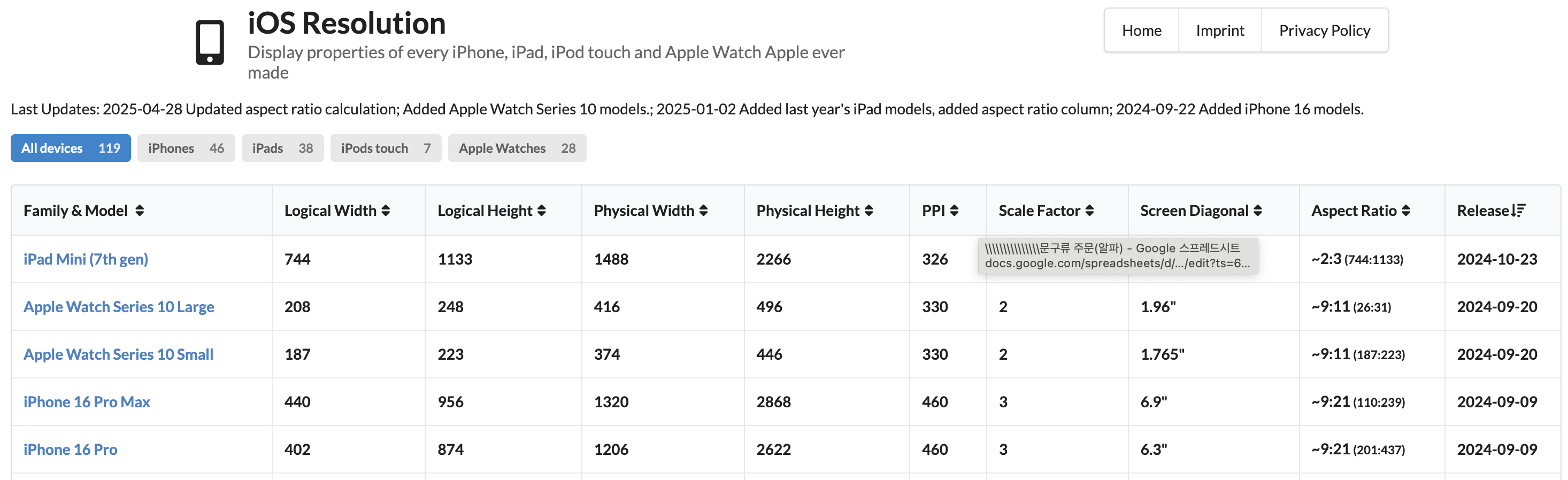 Last Updates: 2025-04-28 Updated aspect ratio calculation; Added Apple Watch Series 10 models.; 2025-01-02 Added last year's iPad models, added aspect ratio column; 2024-09-22 Added iPhone 16 models. All devices 119 iPhones 46 iPads 38 iPods touch 7 Apple